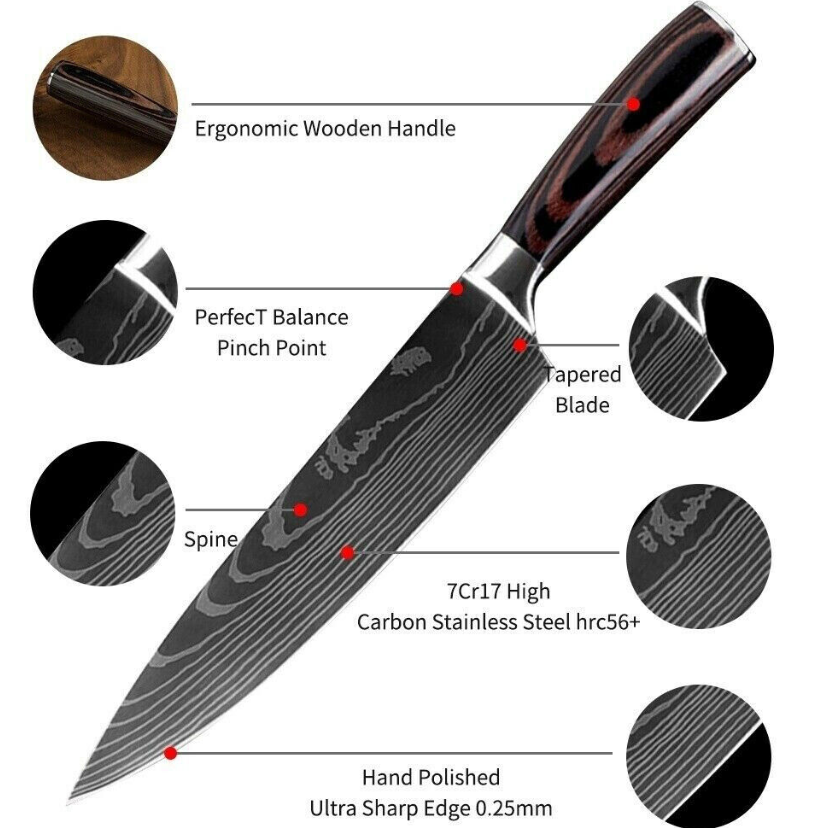 Tips: The blade is 7CR17 stainless steel, the surface of the laser Damascus pattern, very beautiful, good workmanship, razor sharp, keep your kitchen away from the blunt knife, and enjoy your kitchen life!
