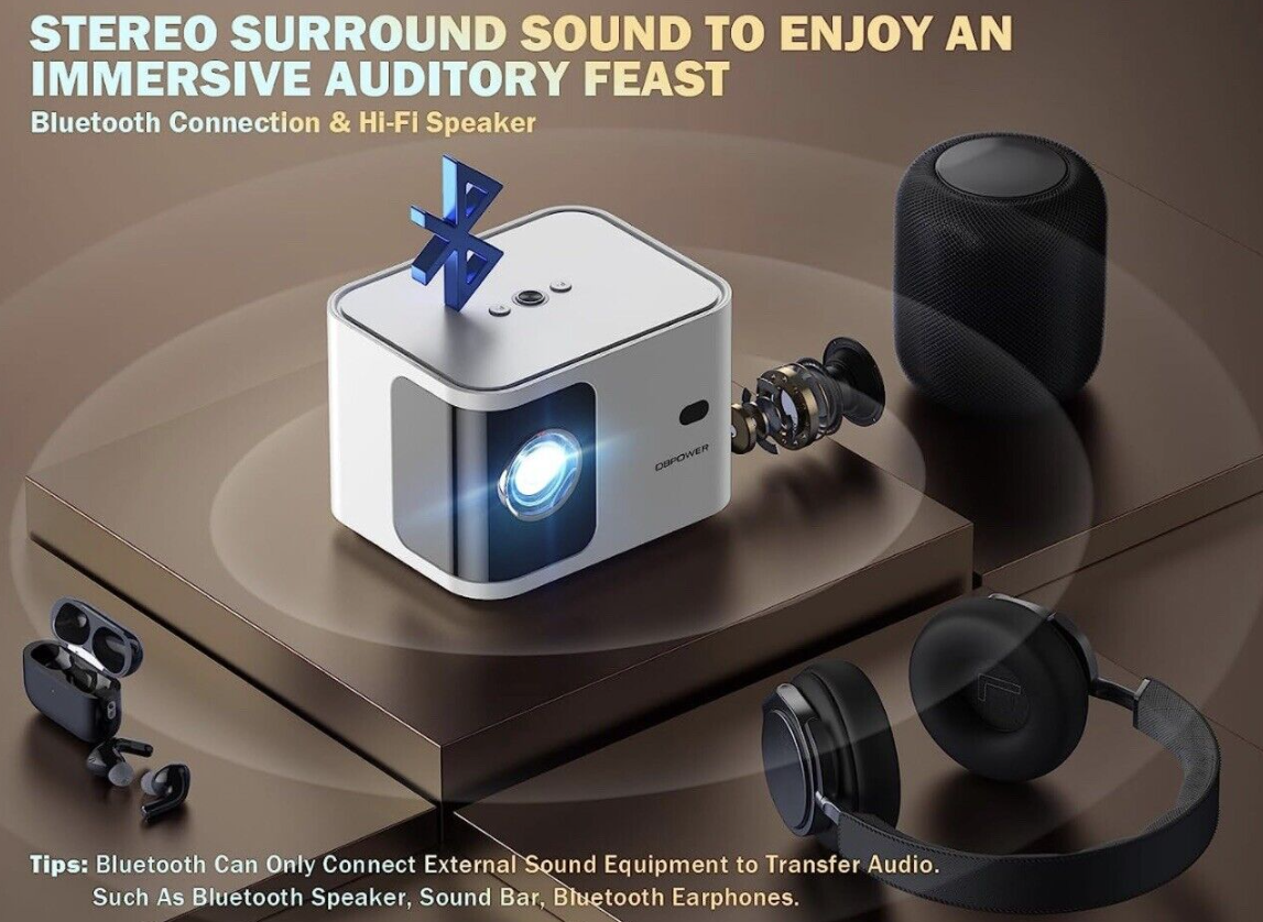 【5G WiFi Projector & 5.2 Bluetooth】Equipped with 2.4+5G dual WiFi6 Tech, compared with other WiFi projectors, it transmits smoother and 0-latency online images and videos. DBPOWER 5G WiFi Bluetooth projector with the latest Bluetooth 5.2, not only a video projector but also a speaker while connecting to phones. Built-in dual 5W Hi-fi stereo sound speakers and Super BT Sensor, this WiFi mini projector receives a signal from devices over 30ft away and creates extraordinary sound.