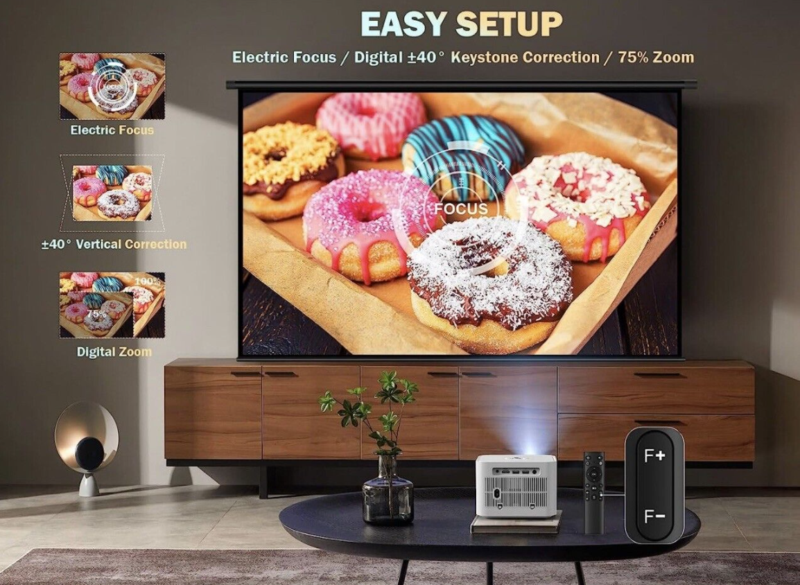 【Innovative Electric-Focus & ±40° Vertical Keystone Correction】DBPOWER H89 WiFi mini projector with the electric focusing, just click the remote to easily focus(If your remote control is lost, the buttons on the projector could also help focusing), and the picture clarity is grasped at will. The advanced Electric Keystone can easily adjust ±40° vertically with remote control. Picture adjustment is no longer limited by placement, you could enjoy your movie night anytime, anywhere.