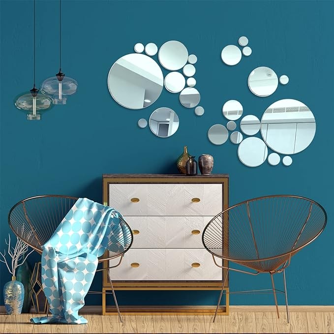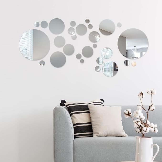 • ?【Package Include】You will get 32 pieces decorative mirror wall stickers in round shape. The acrylic wall stickers have 4 different sizes: 15cm/5.9 inch (2 pieces), 8cm/3.1 inch (4 pieces), 6cm/2.4 inch (6 pieces), 3cm/1.2 inch (14 pieces).