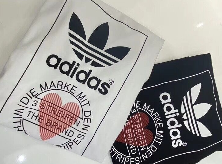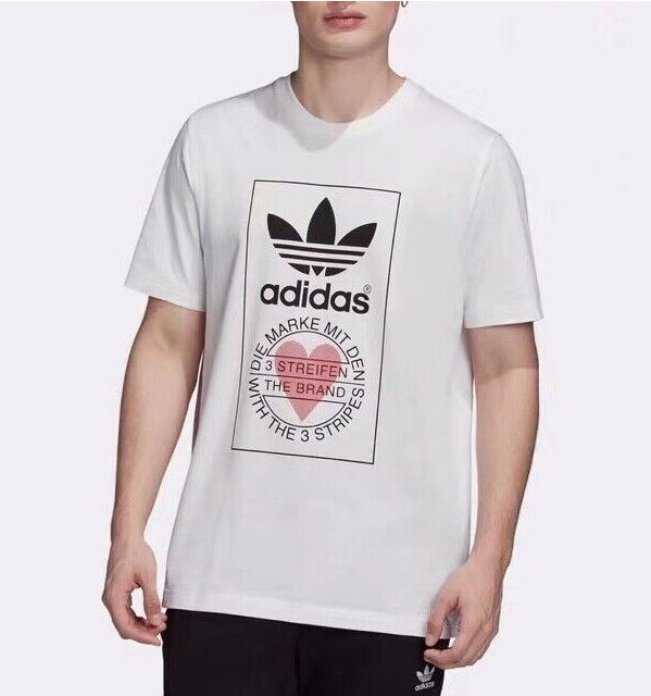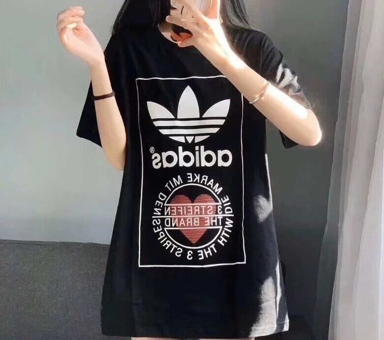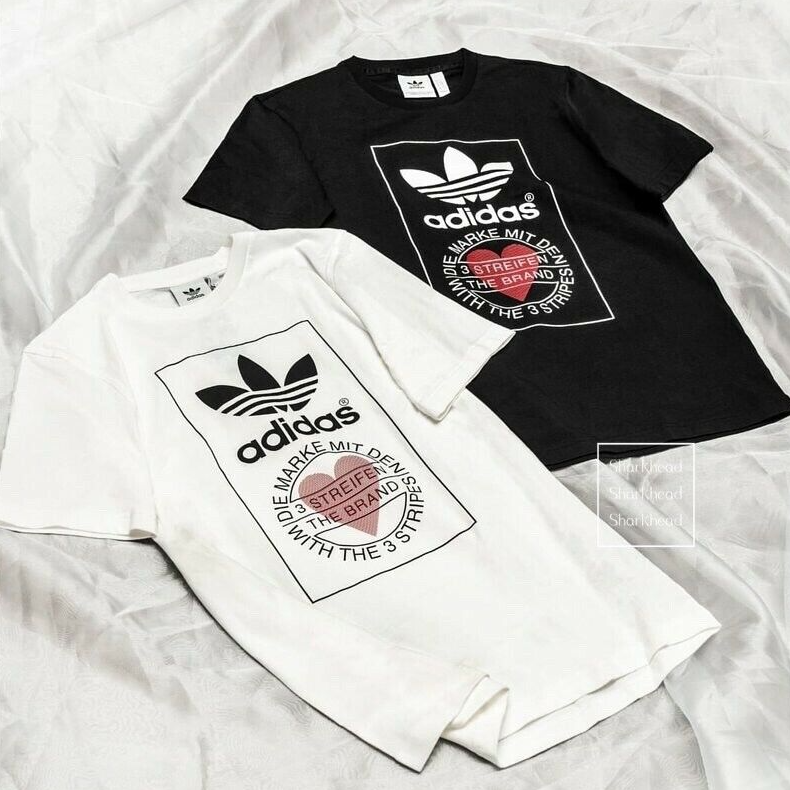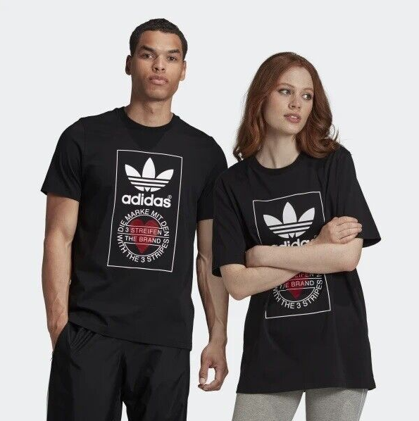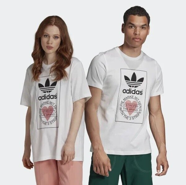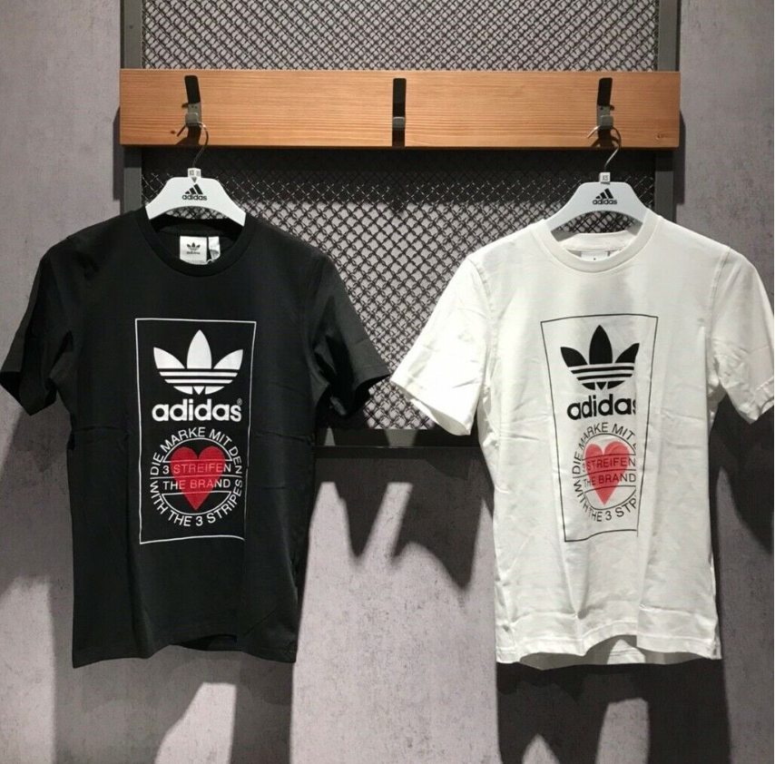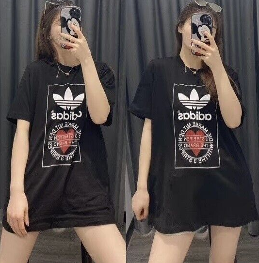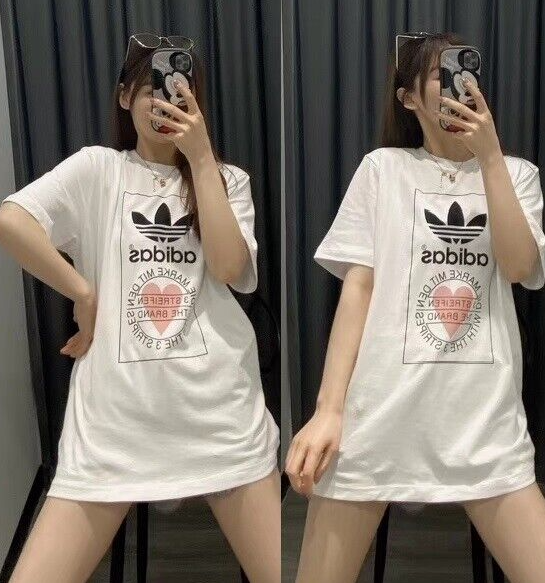 Made from 100% cotton featuring a ribbed neckline, short sleeves and unique heart print added onto Adidas's originals classic logo. This unisex shirt is oversized in fitting and long in length for women, regular fit for men.It is perfect for active wear, or for a casual look.