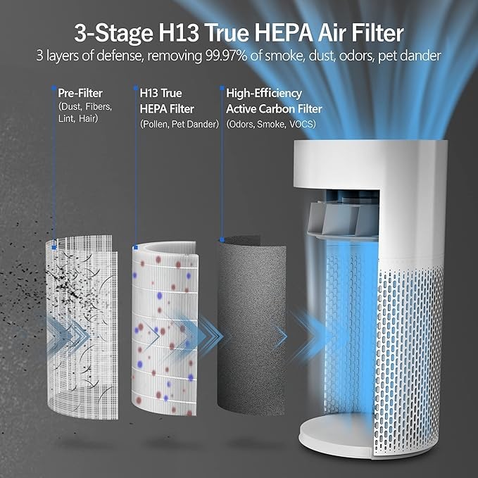 [HIGH PERFORMANCE] 3-Stage filters, the air through pre-filtration, HEPA filtration and activated carbon filtration 3 levels filters, it can capture 99.97% of 0.3 micron air particles, such as dust, dander, smoke, pollen and odor; H13 level filter; 100-240V Voltage ,output 24V 1.5A