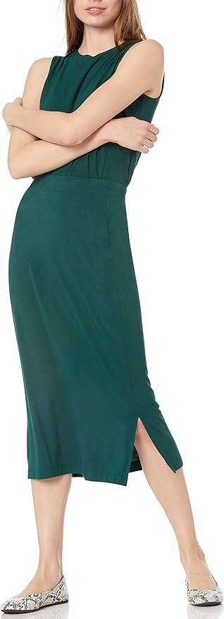 • JERSEY PULL-ON SKIRT: This versatile and easy pull-on midi skirt seamlessly transitions from day to night. Pair with your favorite sneakers for a day exploring the city or dress up for an evening out with Amazon Essentials Women's Two Strap Heeled Sandals.
