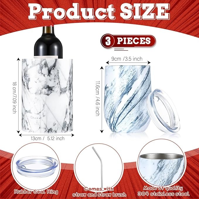 • Portable to Carry: measuring approximately 7.09 x 5.12 inches/ 18 x 13 cm, the marble wine cooler is properly sized for easy handling, accompany it with 2 stainless steel wine cups that come in the package, each with a capacity of around 12 ounces, these portable sizes are practical adds to your picnic or other outdoor parties
