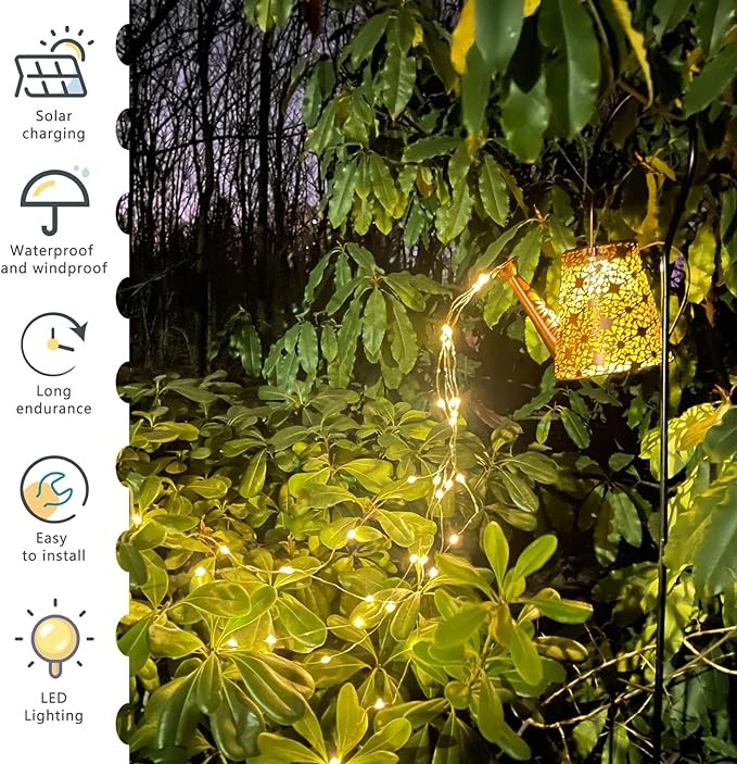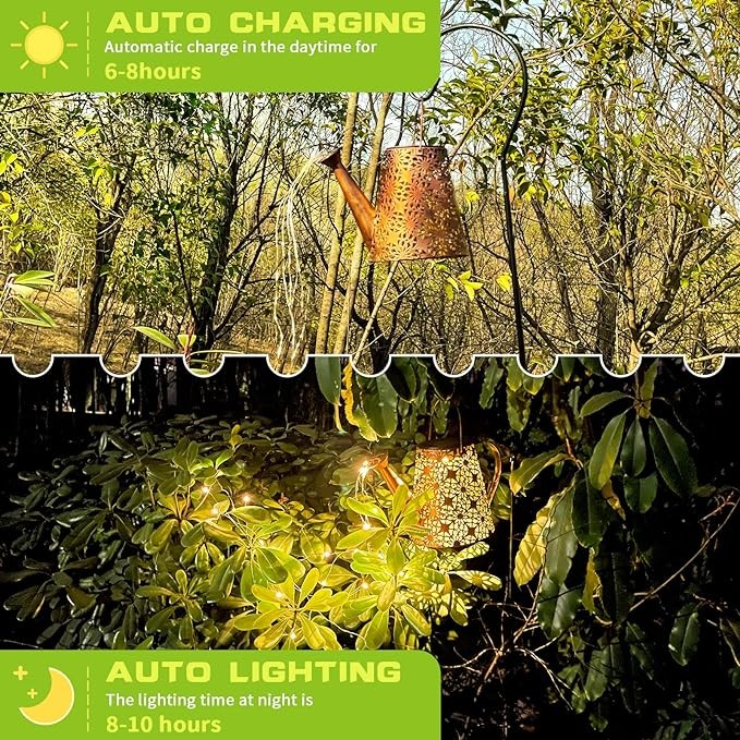• 【OUTDOOR GARDEN LIGHTS】Our solar watering can light decor light collects sunlight during the day and lights itself up at night. It's like having a floating "kettle" in your garden at night that waters your flowers by itself.