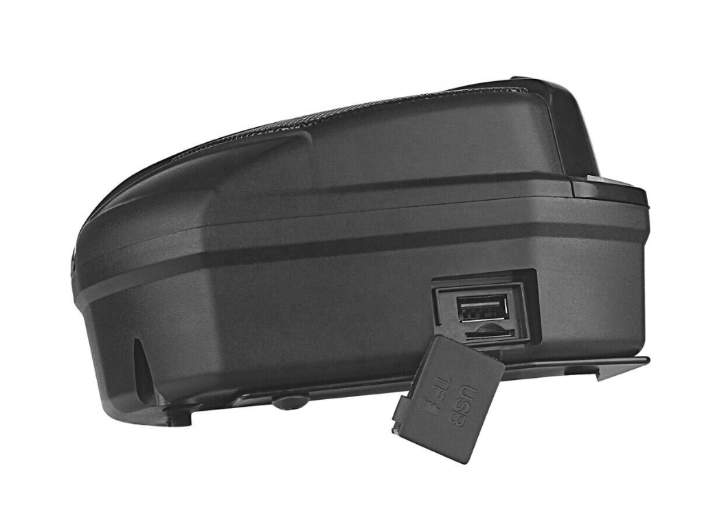 FM Radio Receiver Built in. Support USB and microSD Card MP3 files. Support USB Charging. Blue and White LEDs Light Effect. Perfect for Can-Am ATV UTV Pioneer Polaris RZR Wolverine Yamaha YXZ Kawasaki Mule 4 Wheeler Jeep GoKart Golf Cart Electric Bike Marine Boat.