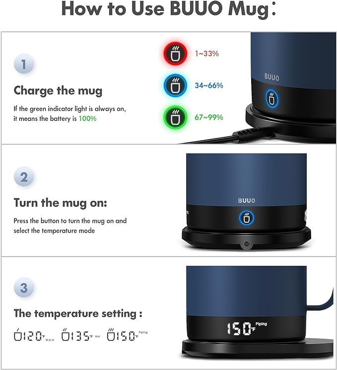 • Simple One-Button Control with Left-Hander Friendly Double-sided LED Display: Press the button to turn on the mug and select the mode. Each time you press the control button, it will cycle through the temperature settings Warm/Hot/Piping on the mug, with the fourth press turning the mug off. The double-sided LED display flashes the mode you select and then shows the real-time temperature of the liquid inside. Even with your left hand, you can grab the real-time temperature on BUUO effortlessly.