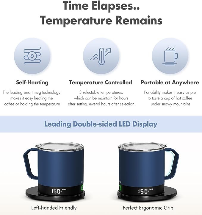 • Auto Sleep Design with Larger 16Oz Capacity: The mug’s simple, elegant design matches any style at home and is also sleek and stylish enough to take to the office. The upgraded 16Oz capacity is perfect for slow sippers throughout the day. If the mug is turned on with no liquid in it, it will automatically turn off after 60 seconds of continuous flashing of error code E1 for 10 seconds.
