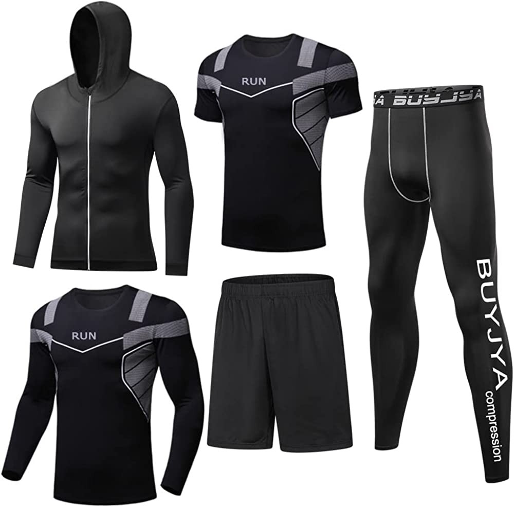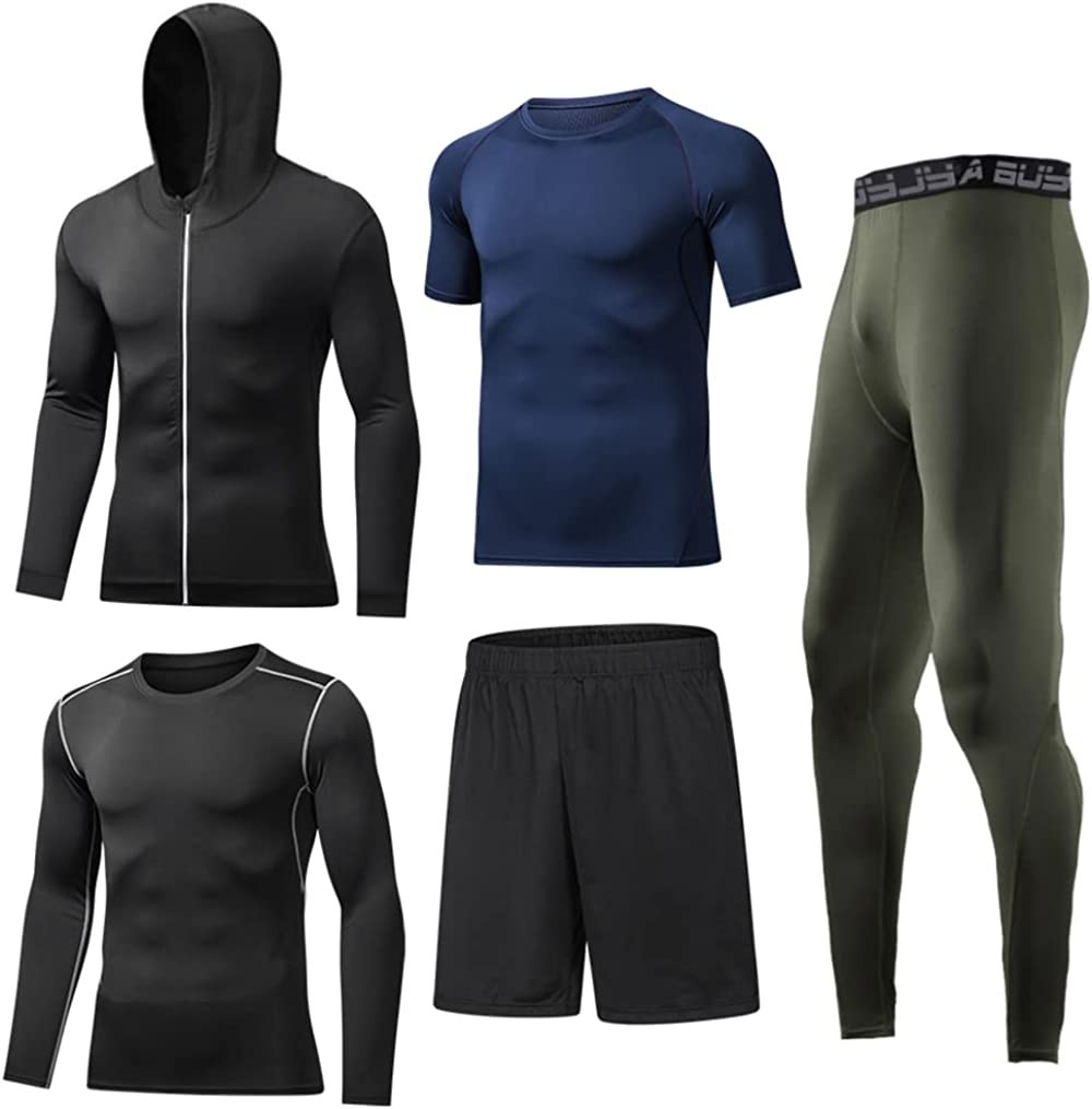 BUYJYA 5Pcs Men's Compression Pants Shirt Top Long Sleeve Jacket Athletic Sets G