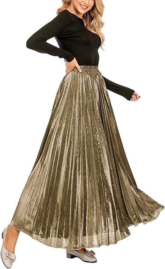 【Occasion】This shimmer metallic pleated flowy midi long skirt is perfect for Halloween, Christmas, Musical Concert, Night Out, Party Club, or Daily Casual