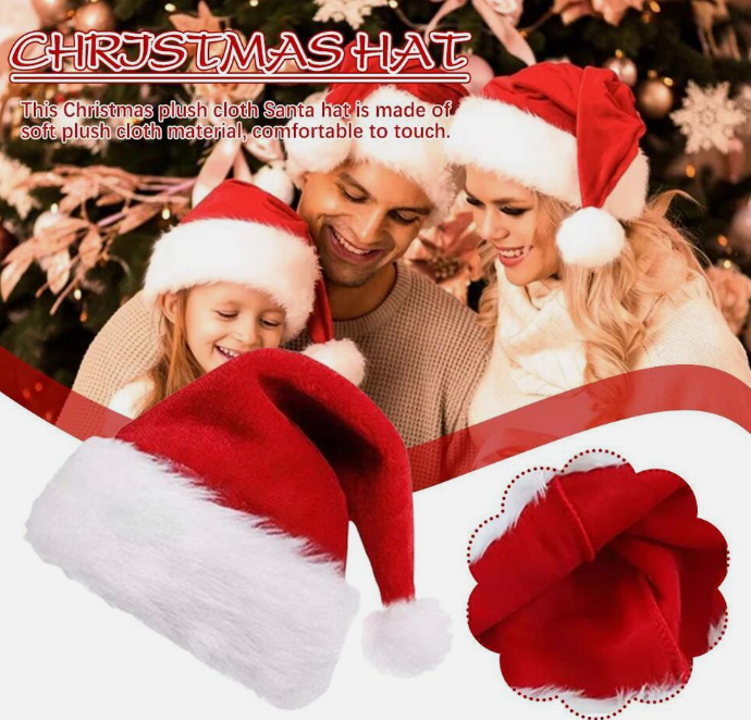 1. High-Quality Material: This Christmas plush cloth Santa hat is made of soft plush cloth material, comfortable to touch.
