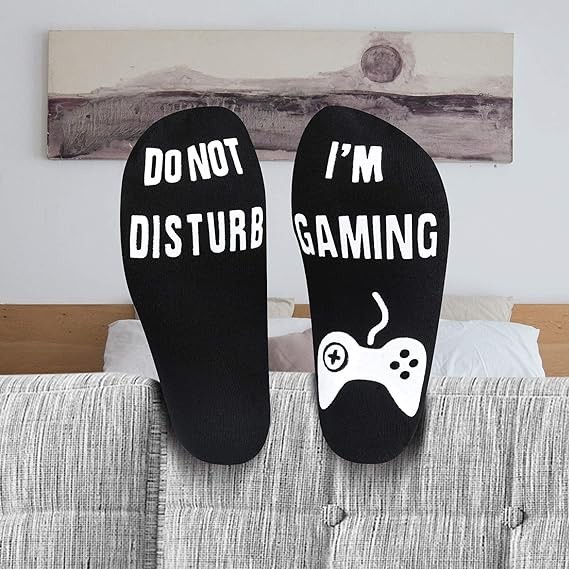 • ?【Funny Novelty Socks "do not disturb im gaming socks"】The novelty gamer socks is Anti-slip with non skid rubber and funny words printed on each sock. Beware use caution when handling the socks if you have a latex allergy. Gaming socks are machine washable, hand washable with similar colors. Teenage boys graduation gift.