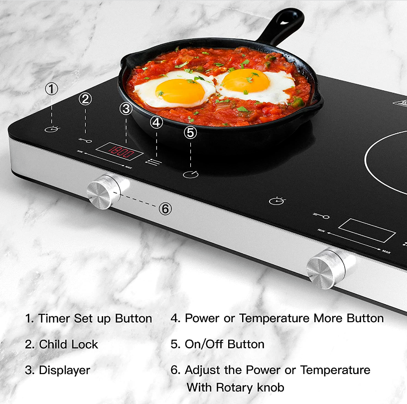 ????? ???? ????? ????????? ???????:1800w quick heating double induction cooktop is faster than a standard double induction burner. Compared with traditional induction stove, it has a higher heat conduction effect, which meets various cooking needs, such as steaming, boiling, fried, frying, slow stewing. Through the knob operation, we can control the heat more accurately, and the ventilation duct design can better dissipate heat and prevent damage to the countertop.