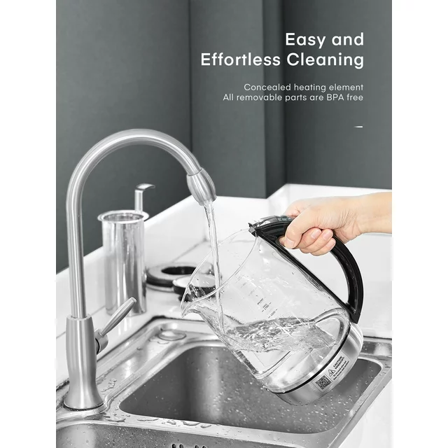 • Fast Boiling & Removable Infuser: 1.7-liter borosilicate glass electric kettle has 1200 watts for fast heat up and a concealed heating element to prevent mineral buildup. A removable tea infuser allows you to place tea bags or loose tea leaves inside to infuse the water. Remove the filter basket once the required brewing time for the type of tea you are making is over to avoid over-infusing.