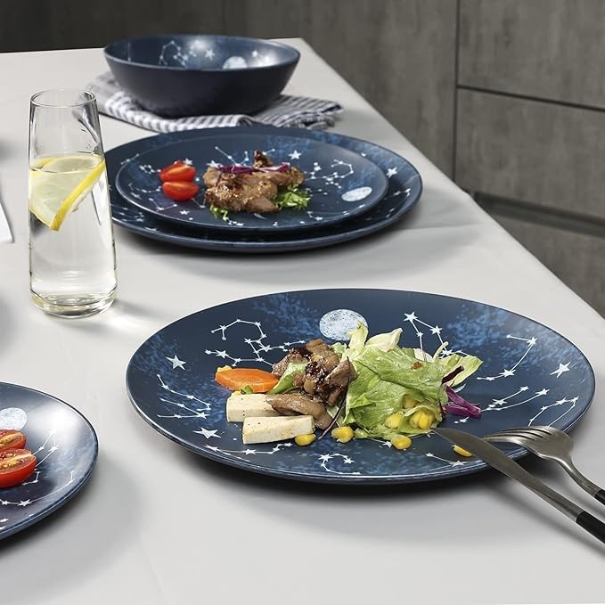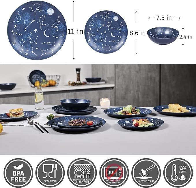 • POPULAR STYLE: These melamine bowls and plates are designed with the popular constellation/galaxy pattern, You could see the combination of modern and mysterious, which is very suitable for daily use in the family. Especially good for the party and camping.