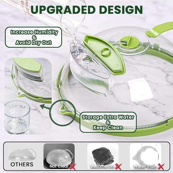 • PREVENT FOOD FROM DRYING: Our upgraded microwave food cover with a water storage box, adds water before use, can increase humidity, and help maintain the moisture and taste of food. This tall microwave plate cover with a dome design avoids contact with foods, perfect instead of cling wrap. What's more, our cover with a diversion groove to store additional steam water, no worrying about water stains. Please rotate the green 360° adjustable vent to the exhaust state when heating.