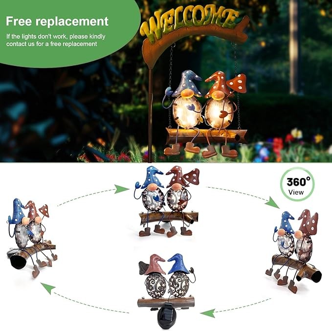 • 【Gnome Patio Decor】The unique and original fairy design, with the gnome partner holding the mushroom playing on the swing with the word "Welcome", makes your garden full of vitality and fun