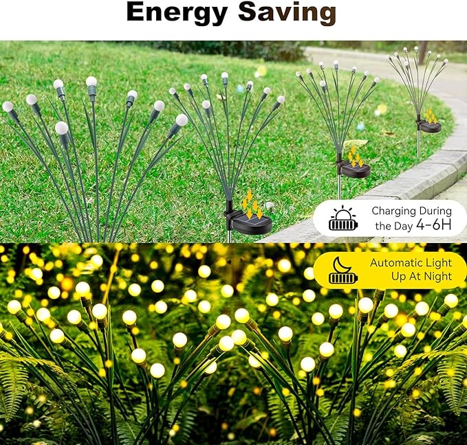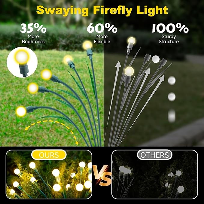 【Upgraded Version of Firefly Light】Solar powered outdoor firefly lights have been upgraded! Differing from ordinary firefly light, this one is designed with green leaves and more lamps, making it better integrated into the garden environment, more natural and more bright. Swaying in the wind like a clutter of fireflies dancing in the grass.