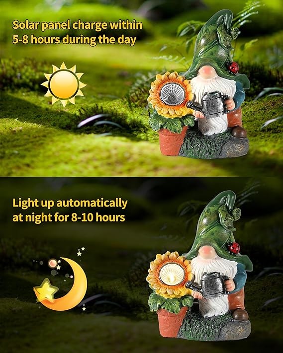 • ?‍♂️ The gnome decorations for home has a sunflower in its hand that has a light in the center. The light automatically turns on at dusk and off at dawn. It emits a warm and cozy glow that creates a relaxing ambiance in any space.