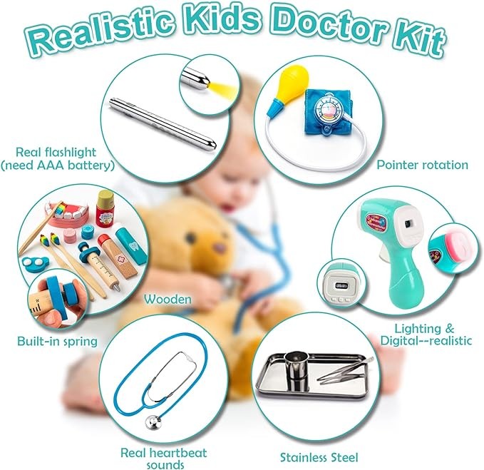• ✅ Realistic Doctor Kit for Kids - This doctor playset is made of real stainless steel and wooden with lights and sounds. You can hear the heartbeat sound when pressing the stethoscope, the air valve ball the blood pressure is squeezable and the indicator of gauge will rotate when pressed, the thermometer can light and show digital, Flashlight, stainless tray, cup, tweezers help children to simulate a doctor to examine and treat wounds, Create a realistic feel for kids while playing.