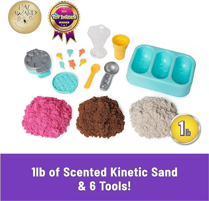 • Includes: 1lb Scented Kinetic Sand (3 Colors), 1 Sand Tray, 1 Sundae Cup, 1 Cone Mold, 1 Spoon, 1 Scoop, 1 Waffle/Cookie Press, 6 Accessories, 1 Instruction Guide