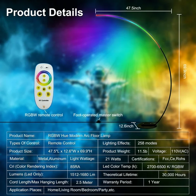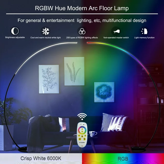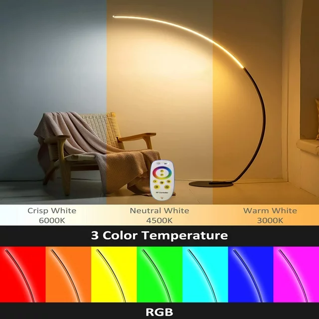 The tall, minimalist RGBW Modern Curve Lamp is the ultimate mood lighting for your living room, office, or bedroom. The sleek design melds perfectly with a contemporary flair to match any home decor style. It features a built-in RGBW LED Strip with 3 white lighting effects, 16 million color options and 358 kinds of light effects. This power-saving LED bulb is good for 20 years with normal use. You'll never have to replace a bulb and save 90% more energy compared to standard halogen or incandescent bulbs.