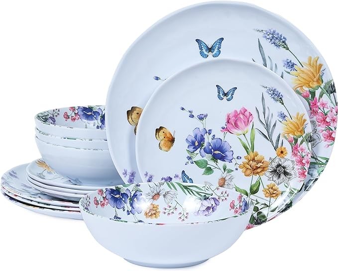 Lechoo 12 Piece Melamine Dinnerware Sets - Plates And Bowls Sets Floral Dinnerware Sets- Spring Camping Dishs Indoor Outdoor Use,Flowers And Butterflies Pattern