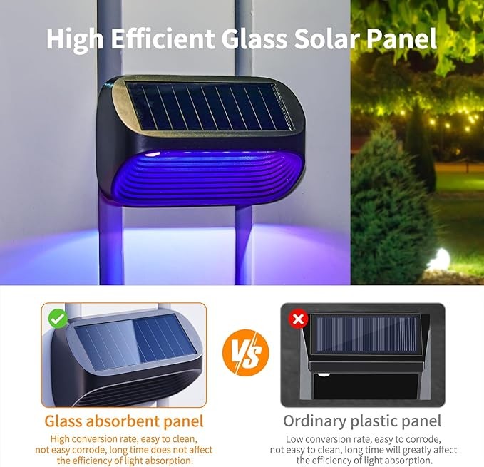 【8 Lighting Modes Solar Fence Lights】 LETMY solar fence lights outdoor provide 8 modes: Cool white, RGB Fade, and 6 Solid Colors. The solar lights outdoor multi-colored changing mode is perfect to meet your holiday or party decor needs. The cool white mode of fence lights solar powered is ideal for daily lighting. Most importantly, you can freely select and fix your favorite colors of the solar lights for outside, match the lighting colors and display them in your backyard.