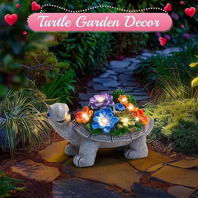 • ?Charming Garden Decor: This turtle solar garden lights comes with 7 warm LED lights, succulents, flowers, leaves and realistic plants like cacti. It is a charming decoration for your garden yard or room, adding a playful touch to your house and garden beautification.