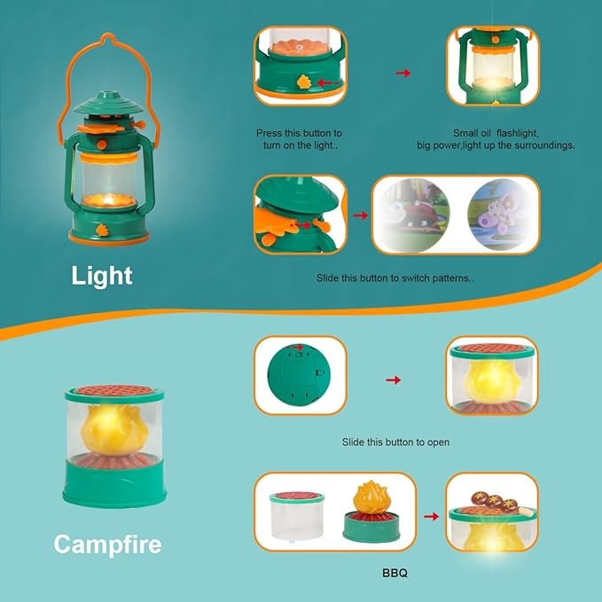 • BATTERY-POWERED KIDS CAMPING GEAR TOYS: A true-to-life campfire with extendable stand and oil lantern can light up with 3 AA batteries (not included) and adjust the binoculars to see the world.