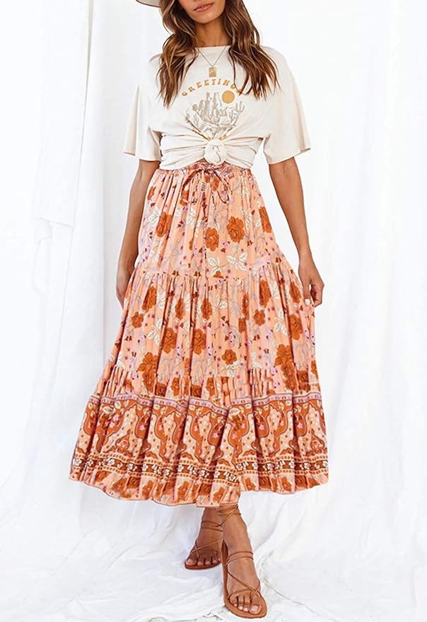 • All the trendy boho floral prints on this soft and comfortable maxi skirt! The perfect above ankle length that stays even when you're seated! with decorative drawstring, ruffles detailing on the bottom, and elastic waistband, It is sure to become a staple in your summer wardrobe.