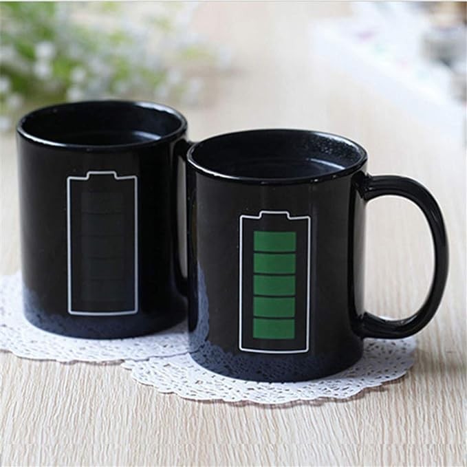 • Battery Pattern Design: The mug is printed with a battery pattern that changes from light to dark when filled with hot drinks, as if the battery is fully charged.