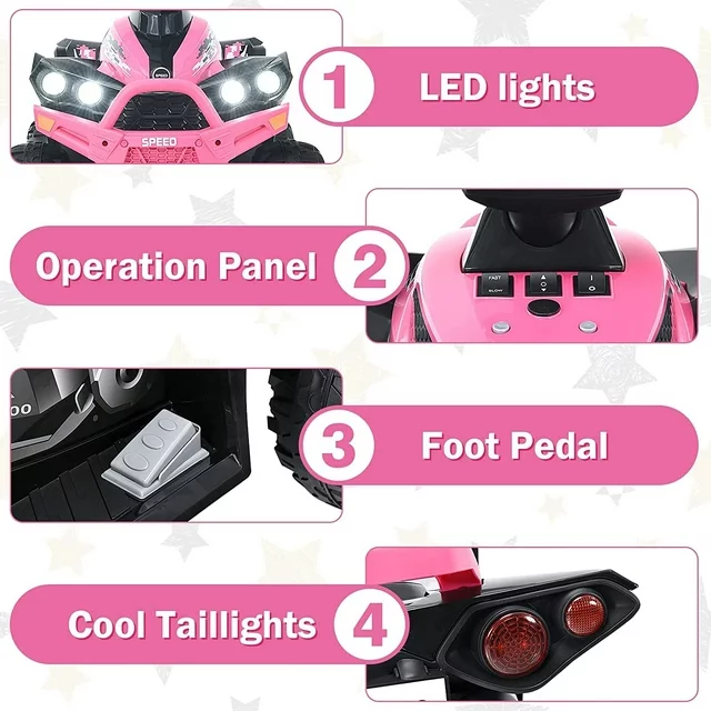 • SLOW START IS SAFER: The ATV 12V seat has a one-button start function which includes high and low speed. Kids can start at a slow speed when starting a super simple operation, so that children drive more safely. In addition, four large diameter wheels increase the stability of the ATV.