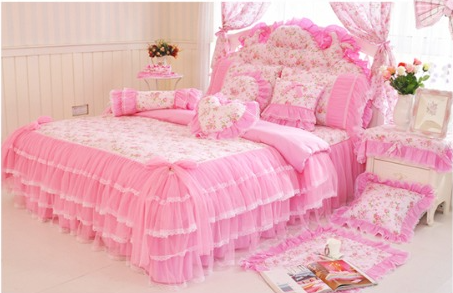 Pink Lace Princess Cotton Bedding Set King Queen 4pcs Duvet Cover Bed Skirts New