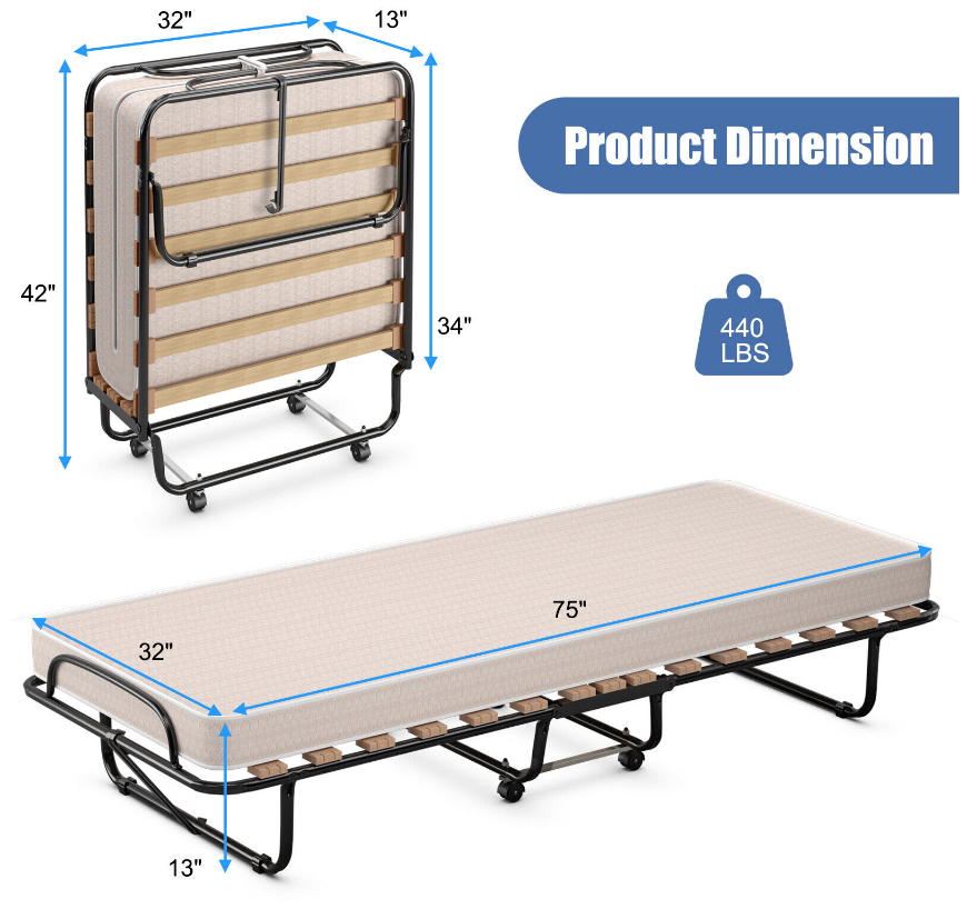 Specifications: Color of Frame: Black Color of Mattress: Beige Material: Steel, Foam, Polyurethane Overall Dimension: 75” x 32” x13'' (L x W x H) Folding Dimension: 32''x 13'' x 42'' (L x W x H) Mattress thickness:2.5” Net Weight: 33lbs Weight Capacity: 440lbs