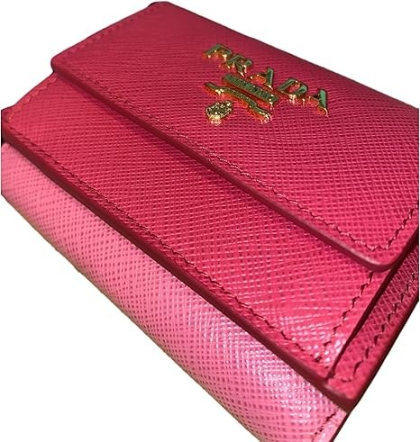 • This classic Prada womens trifold envelope wallet is beautiful inside and out. Crafted in pink saffiano leather the attention to detail is in the clean lines and minimal hardware. This trifold leather wallet features an envelope flap opens to a coin pouch with the iconic gold Prada metal emblem on the front.