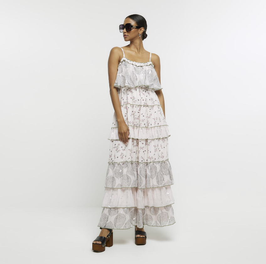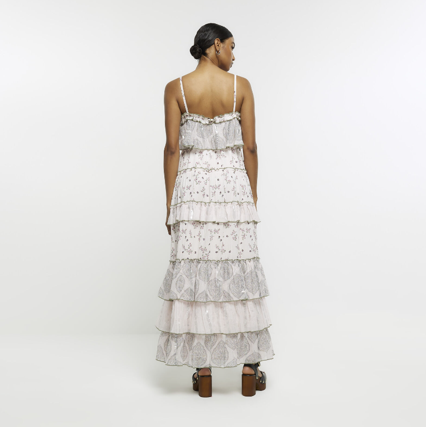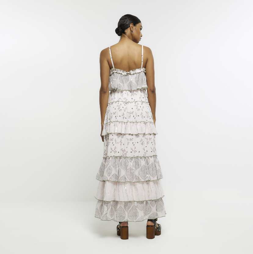 River Island Womens Maxi Dress Pink Tiered Abstract Print Sleeveless