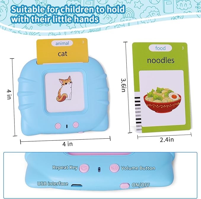 • 【Easy To Operate】Just insert the card into the reader, it will pronounce the words. When an animal card or transport card is inserted, the card reader will also play lifelike animal or transport' s sound. Press the left button to repeat the pronunciation, press volume button to adjust sound (5 levels).