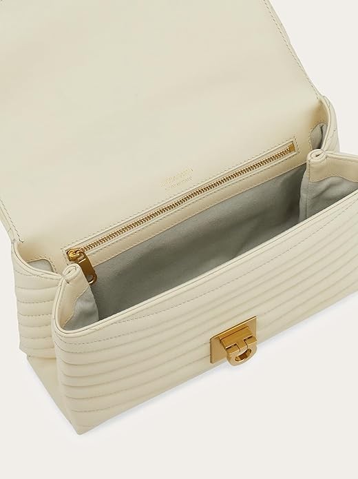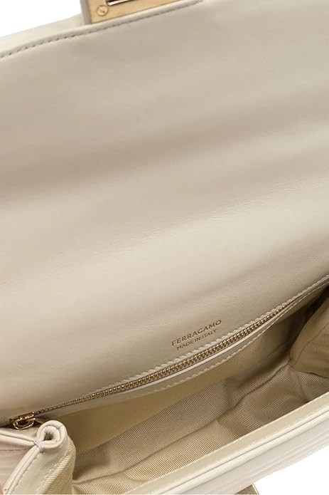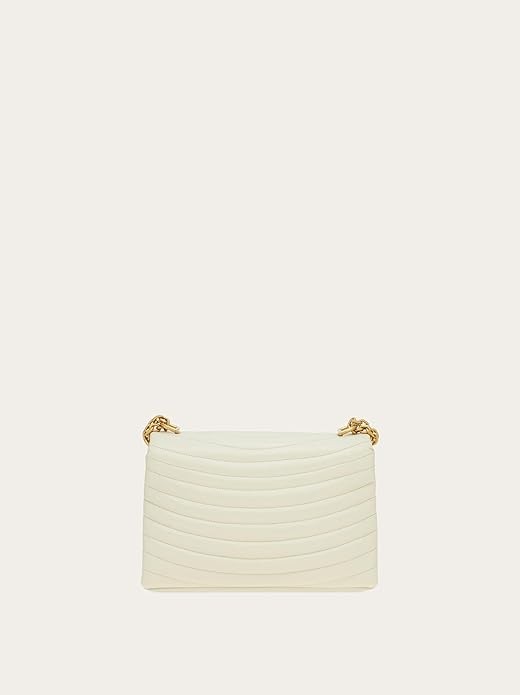 • Ladylike and luxurious, the rippled, padded leather of this chic Ferragamo handbag emphasizes the soft finish of the Italian calfskin. Inspired by the Rainbow Shoe designed by Salvatore Ferragamo for Judy Garland in 1938, the rippling is punctured at the top by two golden Gancio buckles that hold the golden chain strap with leather insert, and on the front flap by a golden Gancio clasp. A new contemporary icon.