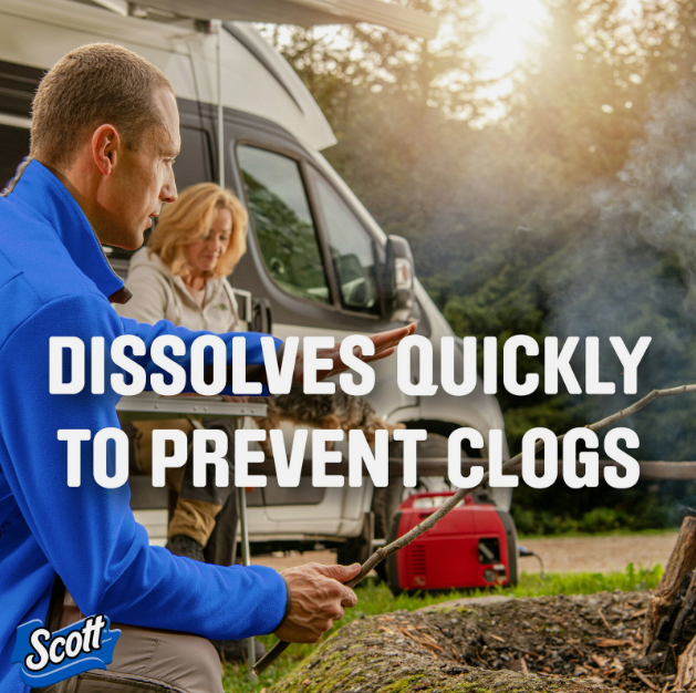 You’ve been around and so have we—Scott Rapid-Dissolving toilet paper is the #1 choice made for RVs, boats, buses, campers and more. With Scott Rapid-Dissolving Toilet Paper, you get 12 regular rolls of 231 sheets, so you have plenty of septic-safe toilet paper that breaks down after use. And our toilet papers are perfect for sensitive plumbing systems and get the job done but are soft and gentle on skin. You won’t even have to worry about clogged pipes: Scott Rapid-Dissolving RV toilet paper is Clog Clinic tested and made of 100% biodegradable tissues. When you’re ready to hit the road, take the septic-safe toilet paper you can trust to help protect your plumbing with our camper toilet paper. We’ve been trusted for generations: Each roll of Scott Rapid-Dissolving Toilet Paper features FSC-certified fiber. *vs the leading brand one ply