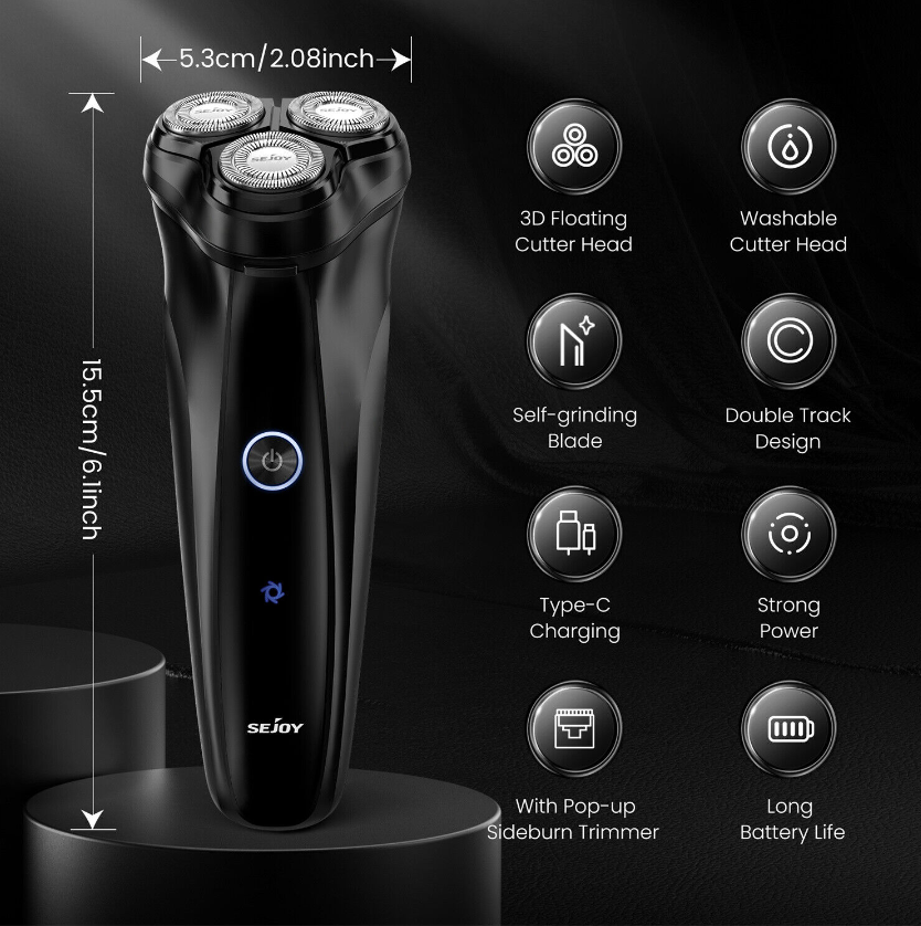 Sejoy Electric Razor for Men 3D Rotary Shaver Rechargeable Beard Pop-Up Trimmer
