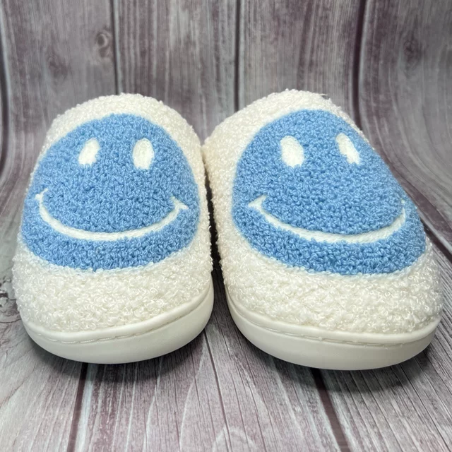 Smiley Face Slippers (Unisex), Slip Resistant, Slide-On House Shoes, Blue (US Womens 9 / Mens 7.5)