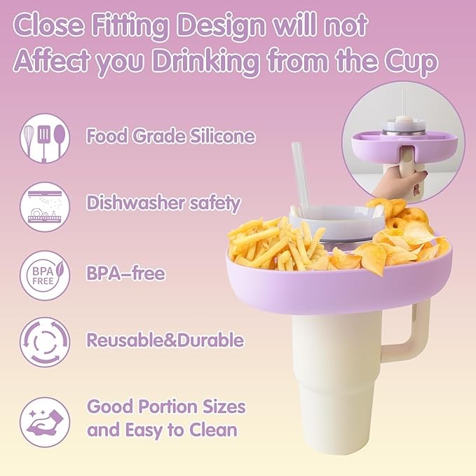 • 【Mounts Securely and Fits Perfectly】The snack tray for stanley cup can fit perfectly into the mouth of the cups,has Good balance and stability,inner flange ensuring a seamless fit and optimal performanceand, preventing wobble or falling.