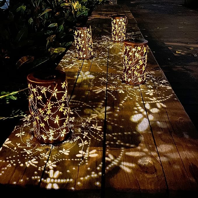 • Gorgeous & imaginative Garden Decor - Fusion the retro gold, copper of exteriors and irregular pattern inside, at darkness, the solar lantern casting a bright, warm light with dragonfly pattern, which looks like a dragonfly flying symbolizes change.