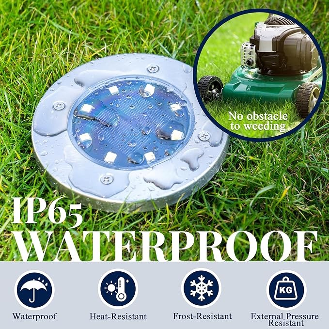 • 【Automatic Turning On and Off】The LED solar disk lights do not require electricity at all. Upgraded solar panel could receive and store more solar energy. Besides, these solar inground lights automatically turn on at night and turn off at dawn or in bright place.