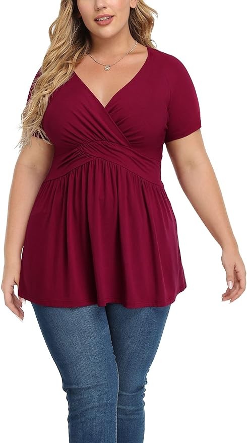 • ❀【Stylish Design】This womens plus size short sleeve tops, feature wrap v neck detail,a little low cut and tindy bit of cleavage showing, elegant yet sexy; middle empire waist belt as a decoration, make you look more slim and created a more flattering look in style. Long enough to cover your hips and belly. This plus size shirts for women suit for spring & summer & fall.