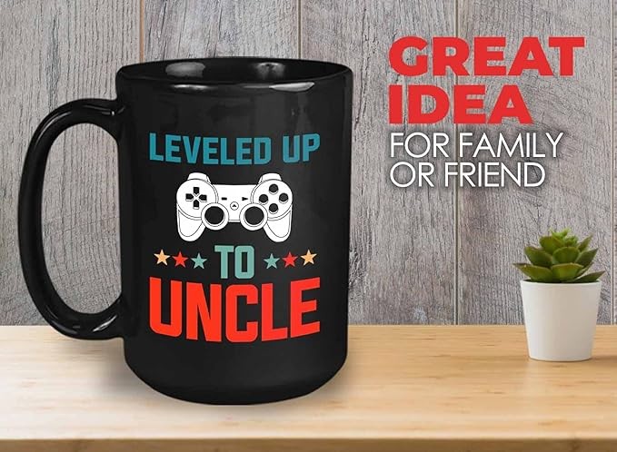 Uncle Coffee Mug - Leveled Up to Uncle - Vintage Fun Unique Gamer Gaming Video Games Father's Day from Aunt Nephew Niece 15oz Black