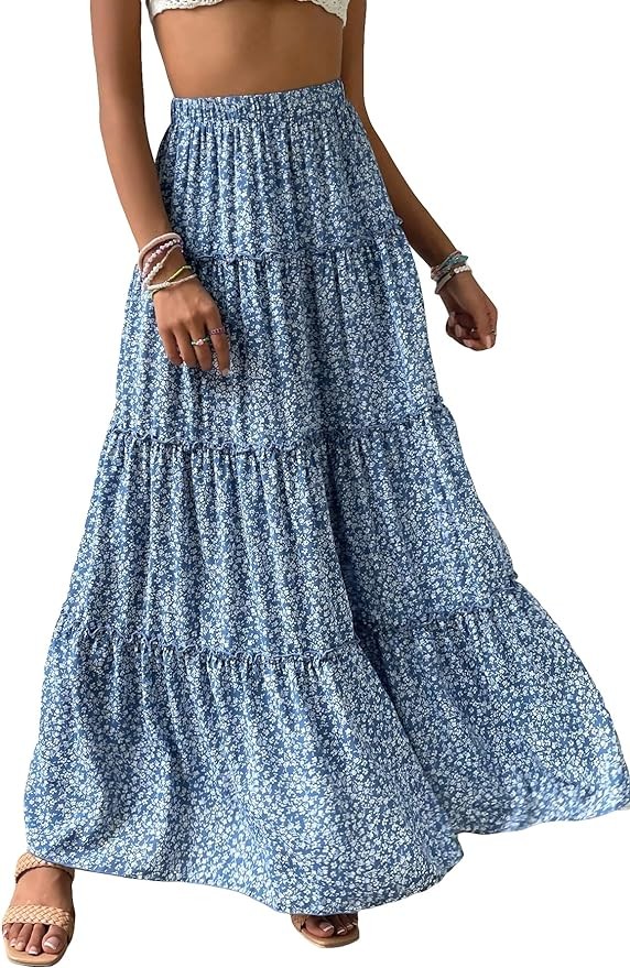 Verdusa Women's Floral Print Elastic High Waist Pleated Ruffle Flowy Long Skirts