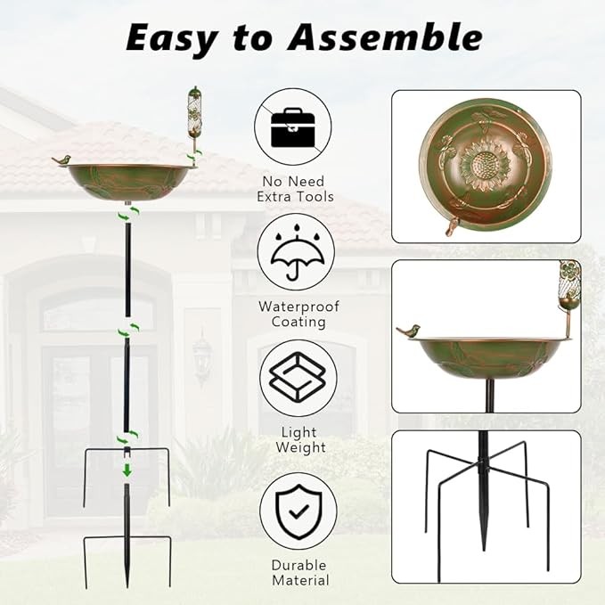 • DURABLE MATERIAL: Our bird baths for outdoors are made of high quality metal materials and coverd with safety coating on the surface. Sturdy and durable, windproof and rainproof, not easy to rust, environmentally friendly, no pungent smell, no need to worry about hurting your feathered friends.