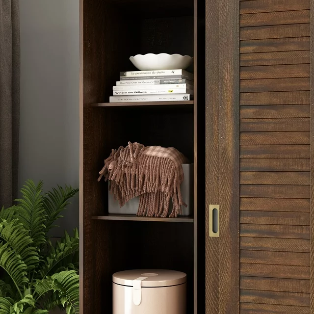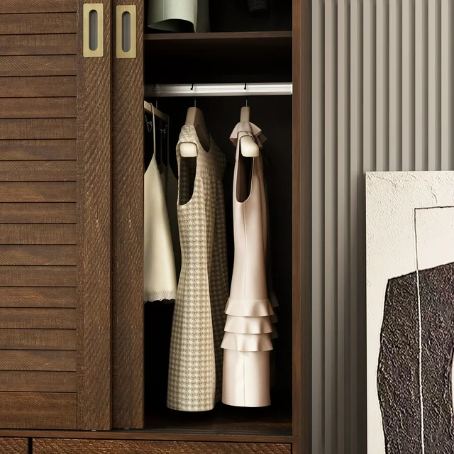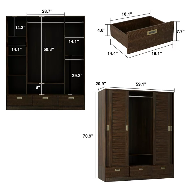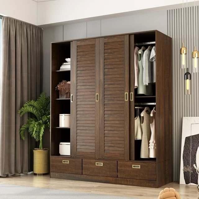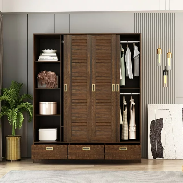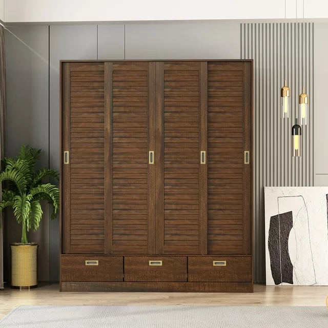 This armoire wardrobe closet features 4 sliding shutter doors, providing good closure for inner space. The shutter design makes doors more fashion and adorable. Combing with brown retro appearance,this 4 door wardrobe brings countryside style for your bedroom space. The armoires and wardrobes has 3 hanging areas with clothing rods, providing enough space to store your suits, shirts and uniforms. Features 5 storage areas ready to hold household items, the 3 bottom drawers offer extra space to store socks, underwear, etc.Makes this an easy fit for those tight rooms that need the space the most.Spacious Clothes Closet: Space is a big problem for storage,this type of closet could give you the big space for clothes.